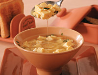 A tálat gyöngyözően forró vízbe állítjuk, a tojást 8-10 perc alatt kigőzöljük, és ha kissé lehűlt, apró kockára vágva adjuk a leveshez.